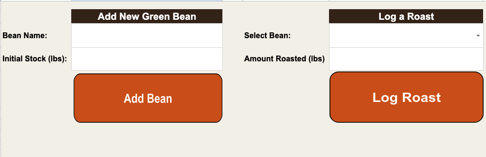 - 🔥 Log a Roast in Seconds: Finished a batch? Use the dynamic dropdown to select your bean, type the weight you roasted, and click “Log Roast.” The tool handles all the math, deducting from your stock automatically.